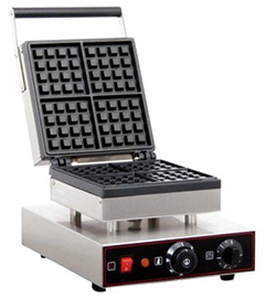 для изготовления 4 бельгийских вафель (1 рабочая поверхность для 4 вафель - 4х4 ячеек), размер одной вафли 100x100x15мм, материал корпуса: нержавеющая сталь, материал жарочной поверхности: литой алюминий с антипригарным покрытием