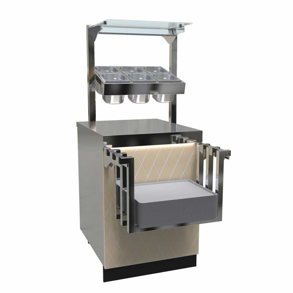 Прилавок для столовых приборов и подносов с хлебницей ПСПХ-70Е предназначен для хранения столовых приборов (ложек и вилок), а также хлеба в составе линии самообслуживания на предприятиях общественного питания