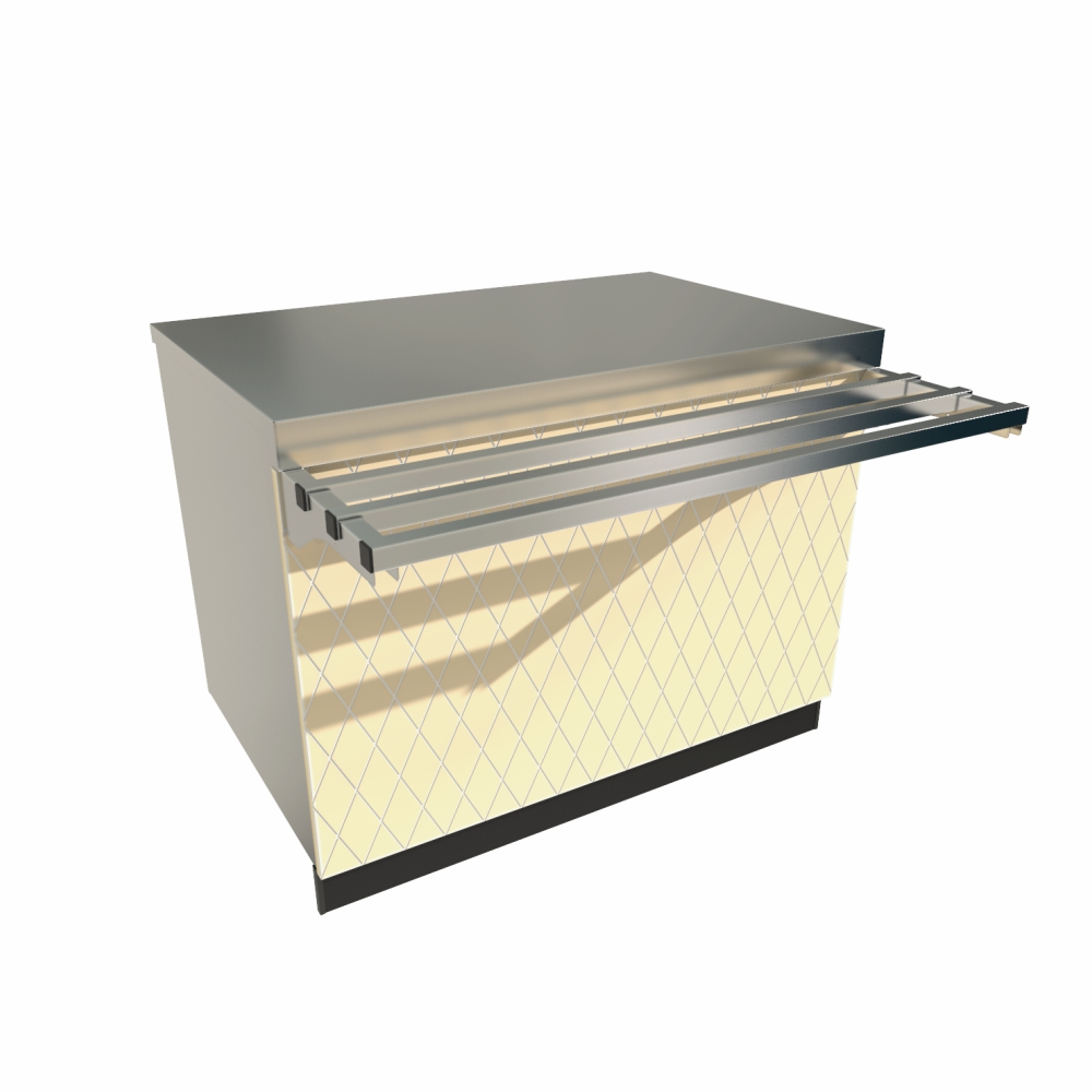 Прилавок горячих напитков предназначен для кратковременного хранения хлебобулочных и кондитерских изделий, а также для установки на его столе электронагревательный прибор (электрочайник) с напитками. Используется на предприятиях общественного питания самостоятельно или в составе технологических линий.