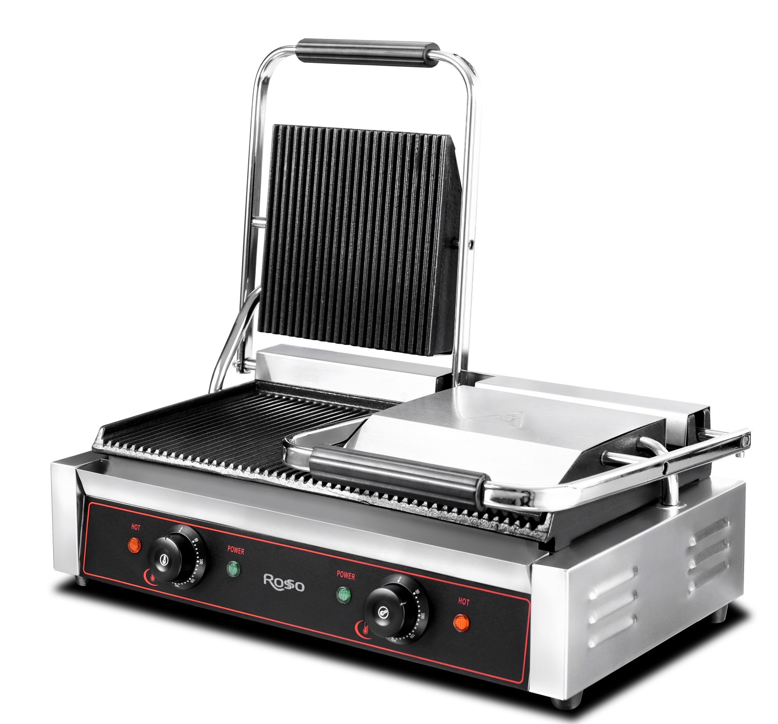 Корпус из нержавеющей стали. Поверхность нагрева - рифлёная, две верхних и две нижних. Температурный режим 0…300°С. Верхняя зона нагрева 345х237 мм.