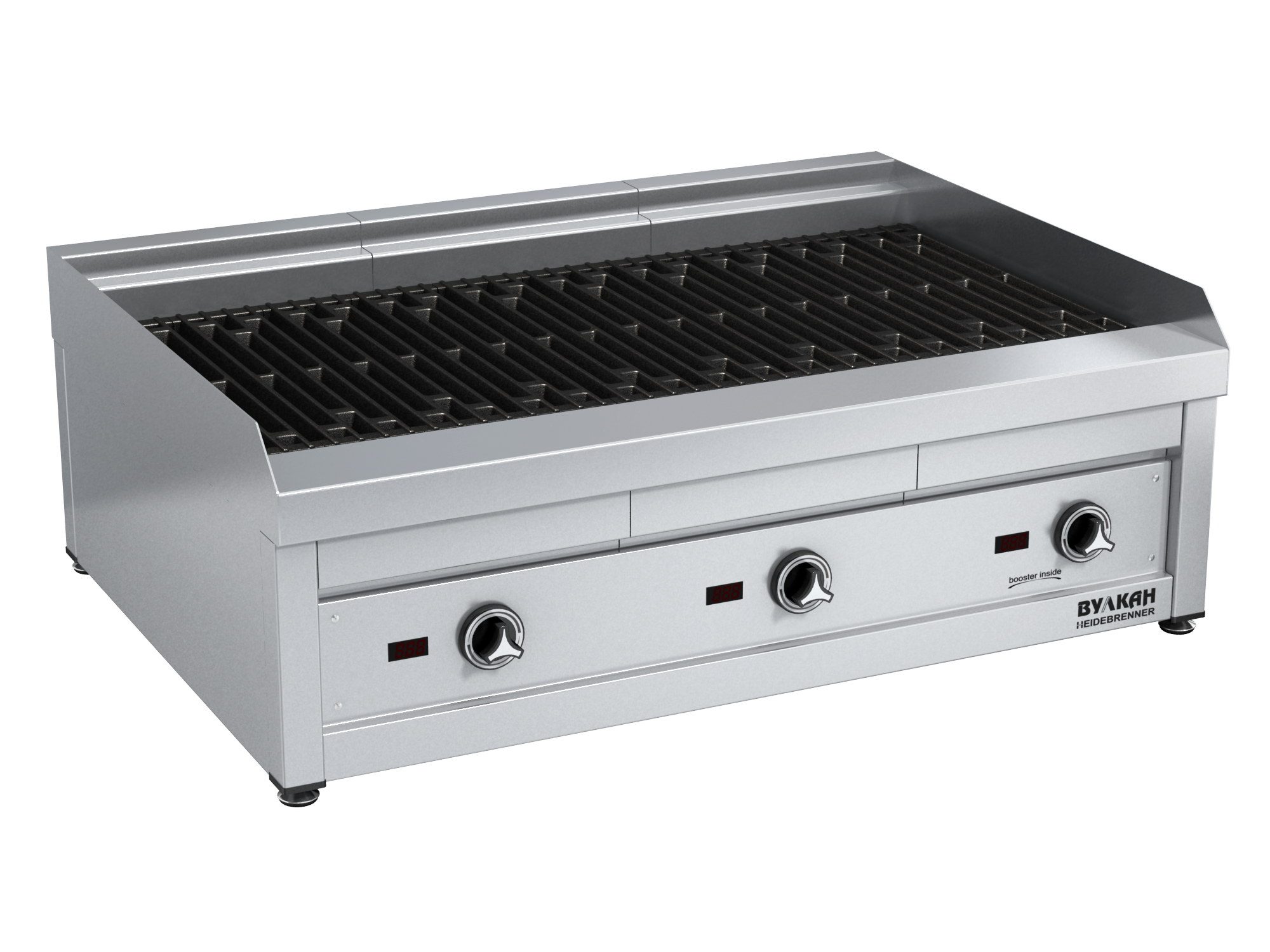 Настольный лавовый гриль из нержавеющей стали с 3-мя зонами нагрева. Особенность этого гриля – наличие лавовых камней, долго держащих тепло и выполняющих роль раскаленных углей. Капли жира, попадая на камни, образуют лёгкий дымок, придающий мясу неповторимый вкус. Добавив на камни немного древесной стружки, вы получите продукт с тонким ароматом копчения. Важная деталь гриля – чугунная решетка, обладающая отличными антипригарными свойствами и придающая продукту характерный рельефный рисунок.