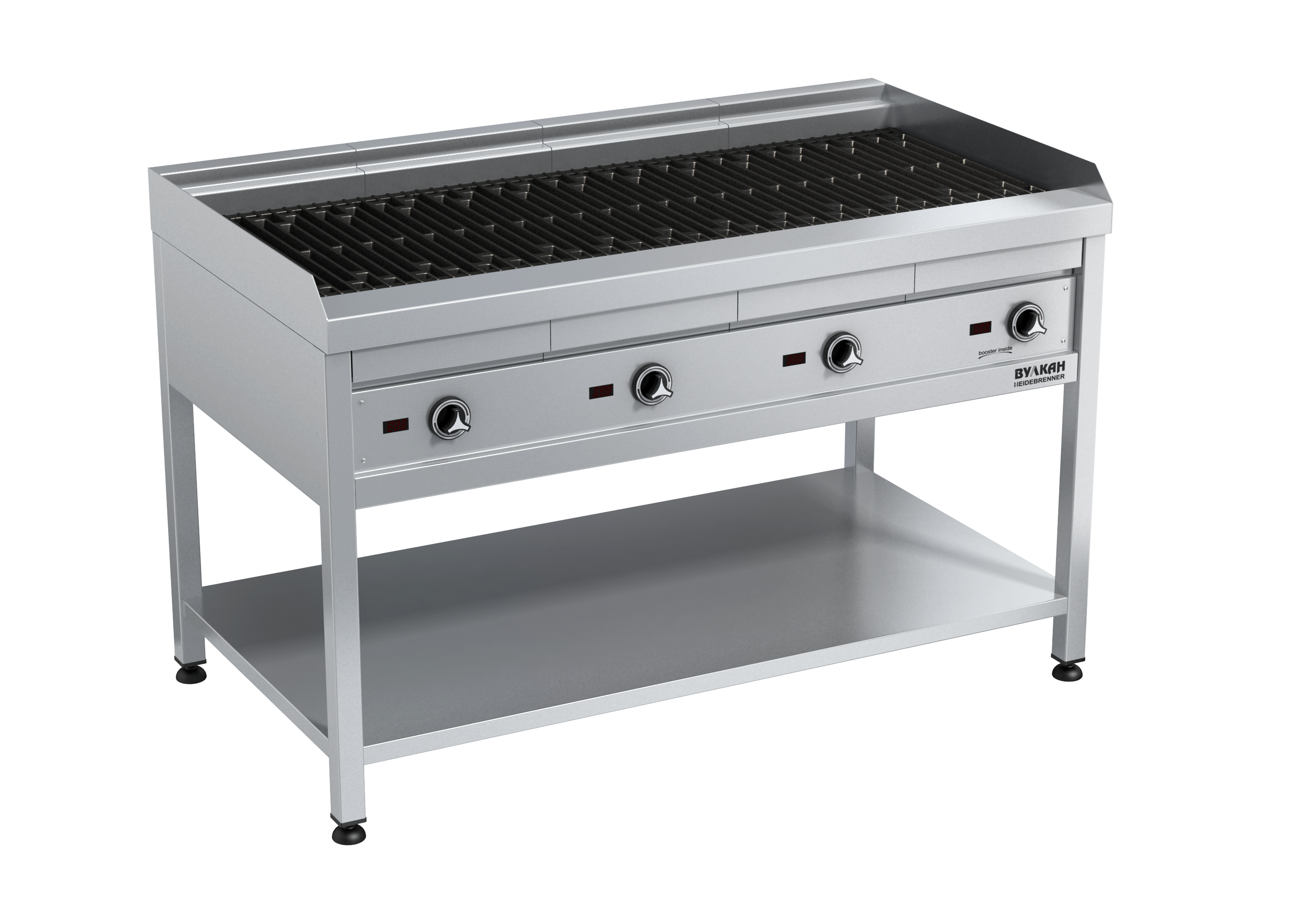 Напольный лавовый гриль из нержавеющей стали с 4-мя зонами нагрева. Особенность этого гриля – наличие лавовых камней, долго держащих тепло и выполняющих роль раскаленных углей. Капли жира, попадая на камни, образуют лёгкий дымок, придающий мясу неповторимый вкус. Добавив на камни немного древесной стружки, вы получите продукт с тонким ароматом копчения. Важная деталь гриля – чугунная решетка, обладающая отличными антипригарными свойствами и придающая продукту характерный рельефный рисунок.