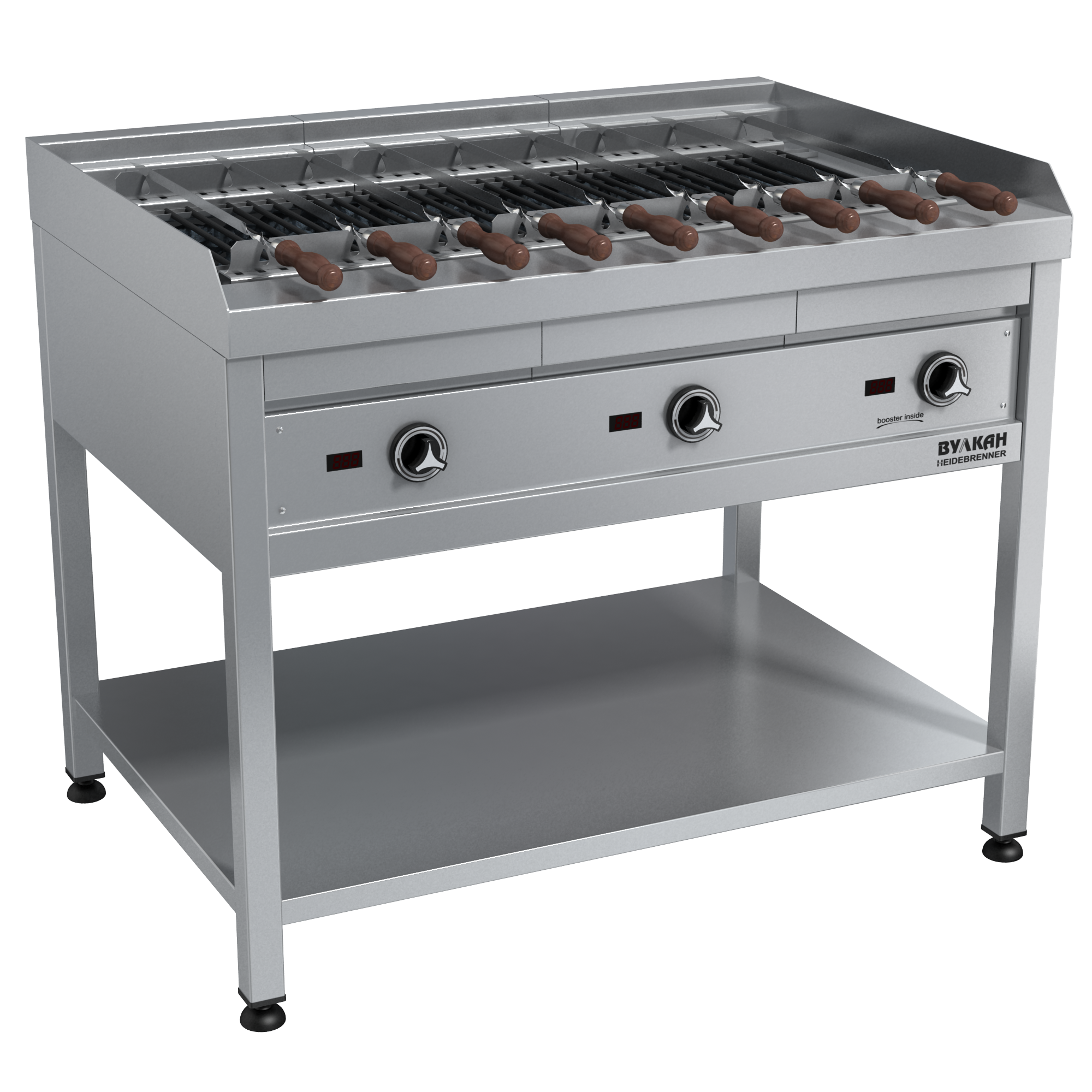 Напольная электрическая шашлычница из нержавеющей стали с 3-мя зонами нагрева. Особенность этой шашлычницы – наличие лавовых камней, долго держащих тепло и выполняющих роль раскаленных углей. Капли жира, попадая на камни, образуют лёгкий дымок, придающий мясу неповторимый вкус. Добавив на камни немного древесной стружки, вы получите продукт с тонким ароматом копчения. Шампура из нержавеющей стали имеют удобную деревянную ручку и специальную геометрию для фиксации их в разных положениях. *Предложение не является публичной офертой. *Изображение на фото, может отличаться от реального.