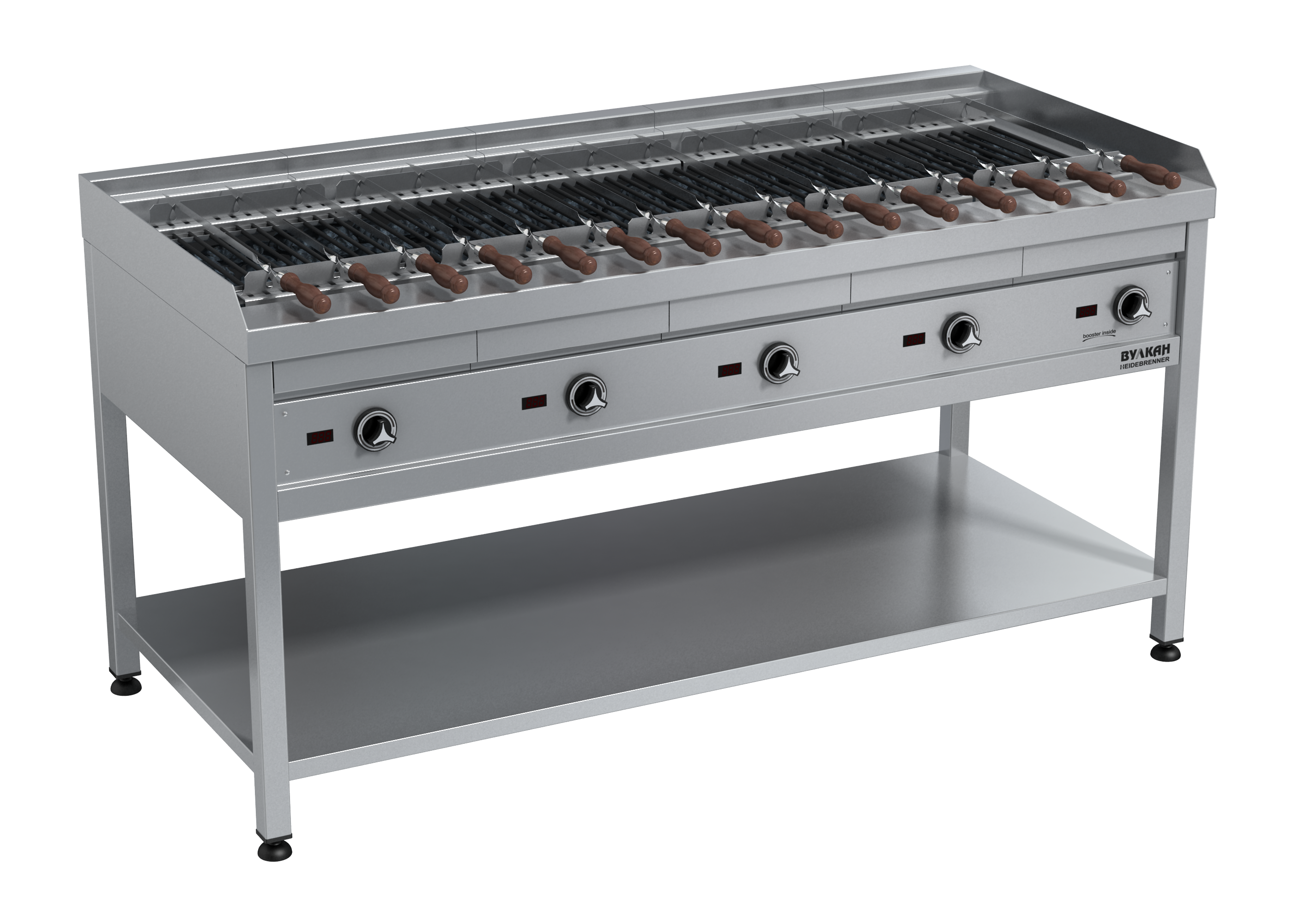 Напольная электрическая шашлычница из нержавеющей стали с 5-ю зонами нагрева. Особенность этой шашлычницы – наличие лавовых камней, долго держащих тепло и выполняющих роль раскаленных углей. Капли жира, попадая на камни, образуют лёгкий дымок, придающий мясу неповторимый вкус. Добавив на камни немного древесной стружки, вы получите продукт с тонким ароматом копчения. Шампура из нержавеющей стали имеют удобную деревянную ручку и специальную геометрию для фиксации их в разных положениях. *Предложение не является публичной офертой. *Изображение на фото, может отличаться от реального.