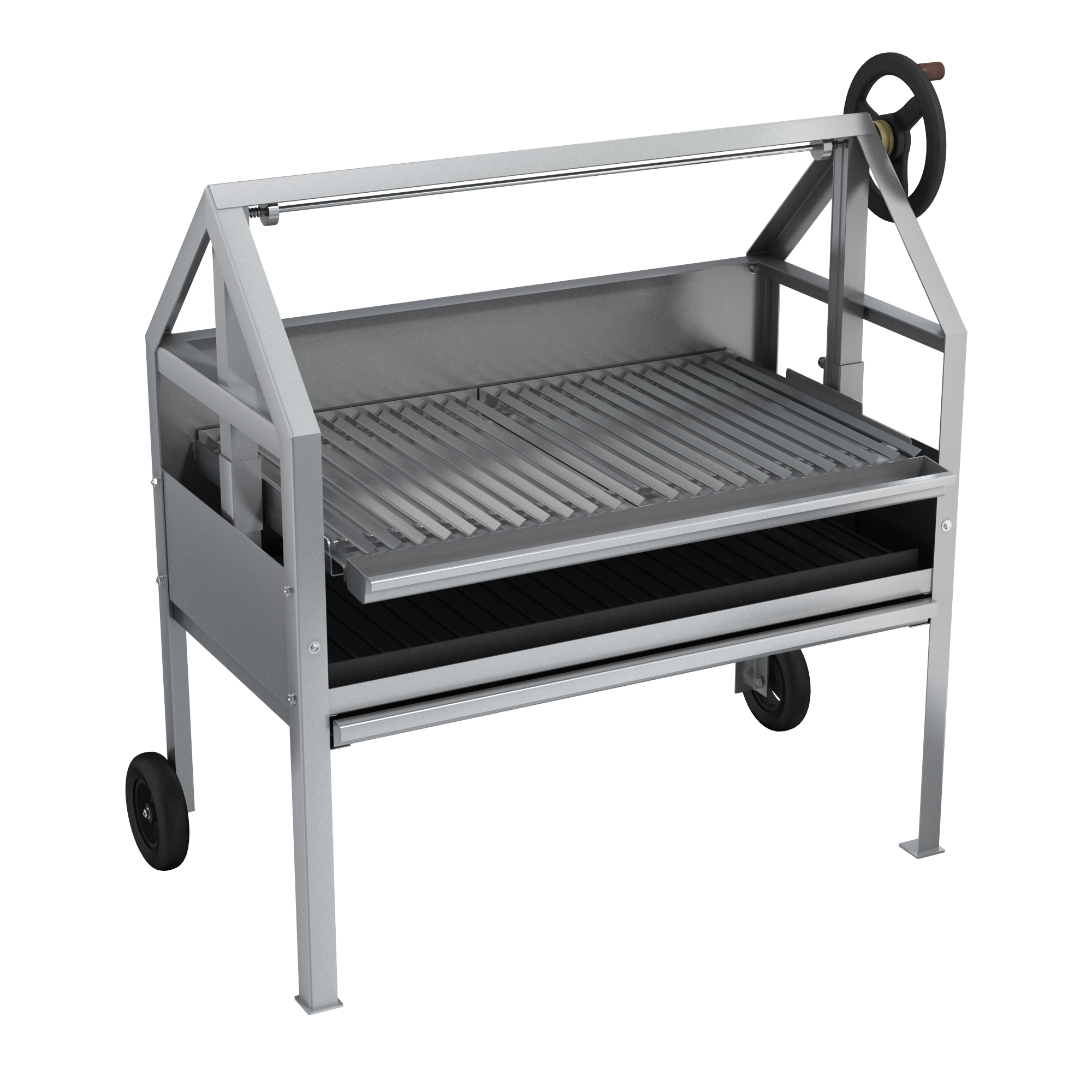 Угольный гриль из нержавеющей стали, мобильный. Предназначен для приготовления мяса на открытом огне. Мангал выложен огнеупорным камнем, степень прожарки мяса регулируется перемещением решетки с продуктом выше иили ниже относительно огня, V-образный профиль решетки позволяет задерживать излишки жира. *Предложение не является публичной офертой. *Изображение на фото, может отличаться от реального.