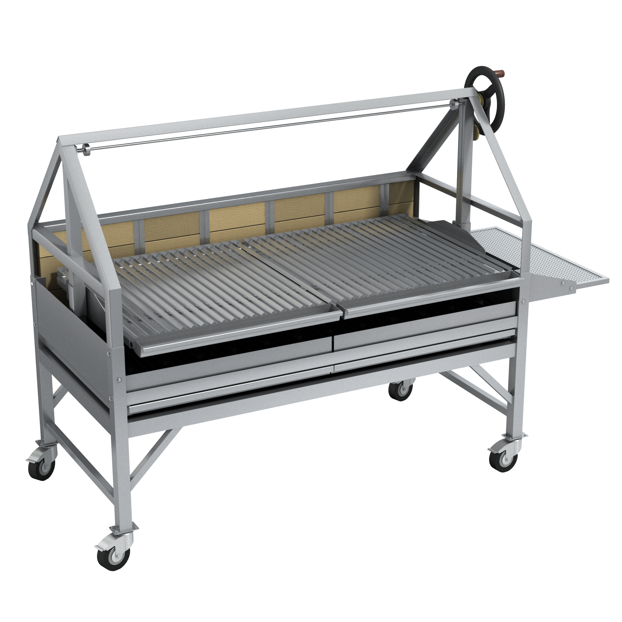 Угольный гриль из нержавеющей стали, мобильный. Предназначен для приготовления мяса на открытом огне. Мангал выложен огнеупорным камнем, степень прожарки мяса регулируется перемещением решетки с продуктом выше иили ниже относительно огня, V-образный профиль решетки позволяет задерживать излишки жира. *Предложение не является публичной офертой. *Изображение на фото, может отличаться от реального.