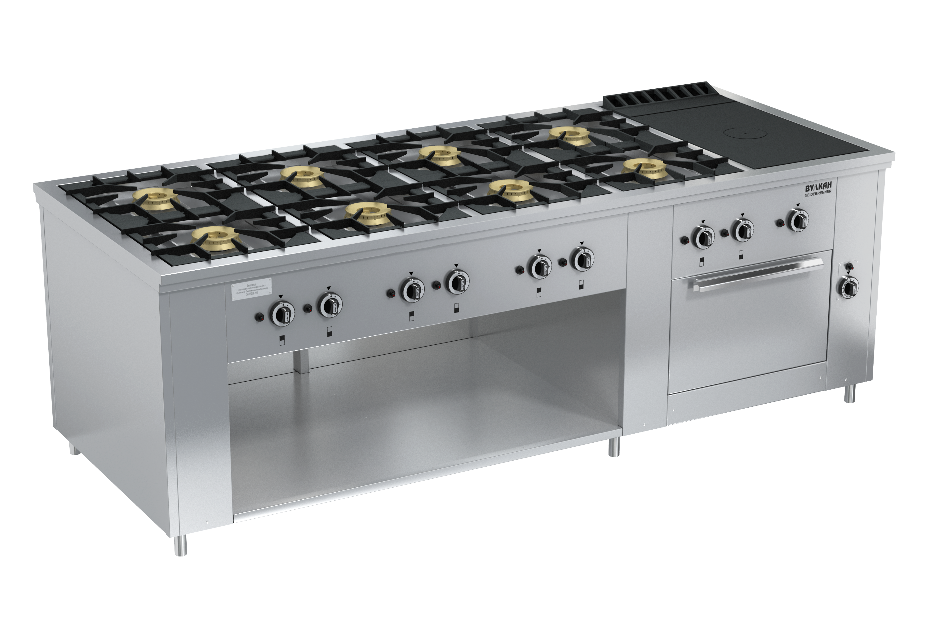 Плита из нержавеющей стали с 8-ю двухрядными горелками и варочной чугунной поверхностью. Открытые горелки имеют массивные чугунные решетки размером 430х430 мм, что позволяет размещать на них гастроемкости объемом до 50 л, съёмная подконфорочная емкость. Под чугунным настилом располагается мощная горелка, быстро и равномерно нагревающая всю поверхность рабочей зоны, благодаря чему на нем можно разместить как крупные гастроемкости, так и множество мелких. В нижней части плиты-жарочный шкаф с диапазоном температур 110-325°С и ниша для хранения кухонного инвентаря. Газконтроль, запальные горелки, пьезоподжиг каждой горелки, работа на природном или сжиженном газе. Ножки плиты регулируются по высоте. *Предложение не является публичной офертой. *Изображение на фото, может отличаться от реального.