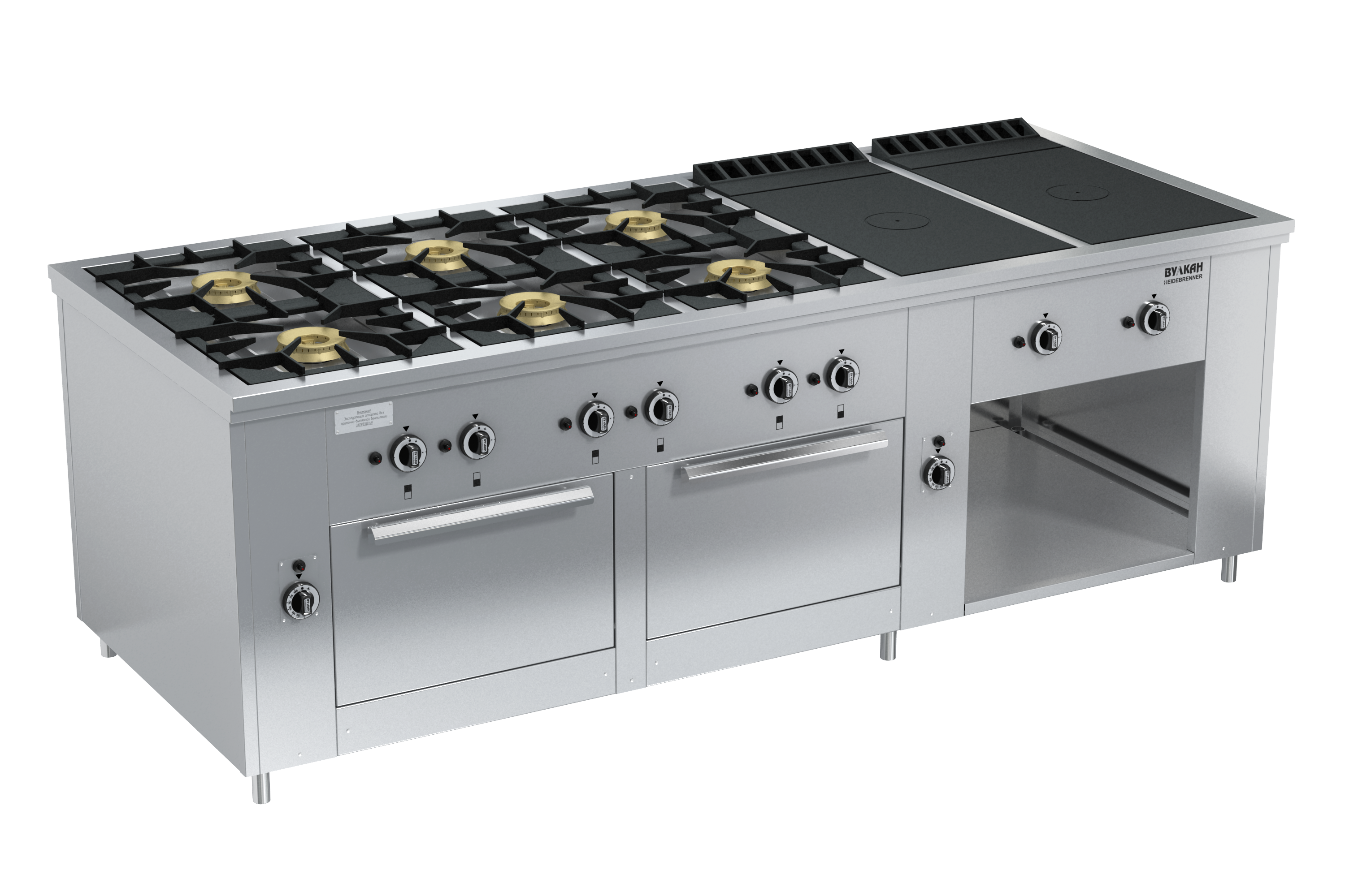 Плита из нержавеющей стали с 6-ю двухрядными горелками и 2-мя варочными чугунными поверхностями. Открытые горелки имеют массивные чугунные решетки размером 430х430 мм, что позволяет размещать на них гастроемкости объемом до 50 л, съёмная подконфорочная емкость. Под чугунными настилами располагаются мощные горелки, быстро и равномерно нагревающие всю поверхность рабочей зоны, благодаря чему на них можно разместить как крупные гастроемкости, так и множество мелких. В нижней части плиты-2 жарочных шкафа с диапазоном температур 110-325°С и ниша для хранения кухонного инвентаря. Газконтроль, запальные горелки, пьезоподжиг каждой горелки, работа на природном или сжиженном газе. Ножки плиты регулируются по высоте. *Предложение не является публичной офертой. *Изображение на фото, может отличаться от реального.