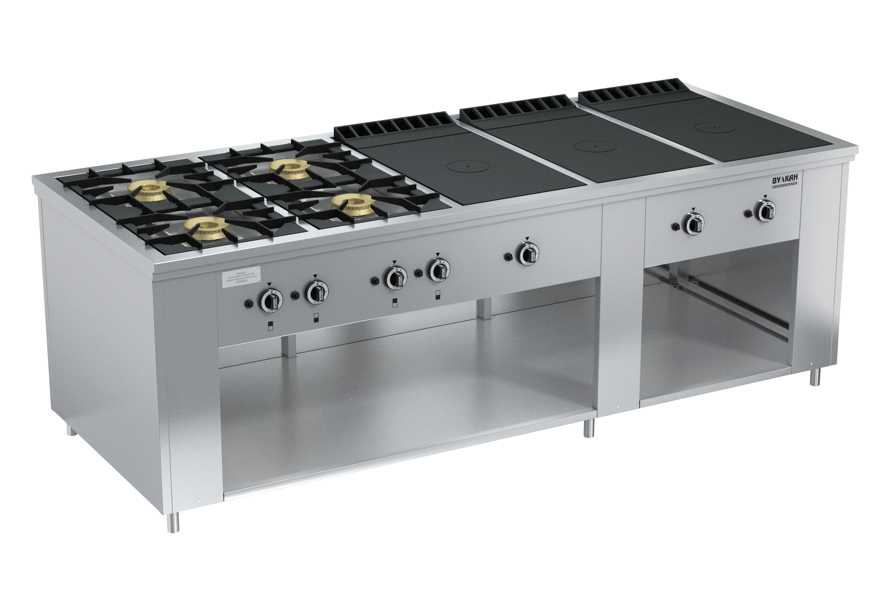 Плита из нержавеющей стали с 4-мя двухрядными горелками и 3-мя варочными чугунными поверхностями. Открытые горелки имеют массивные чугунные решетки размером 430х430 мм, что позволяет размещать на них гастроемкости объемом до 50 л, съёмная подконфорочная емкость. Под чугунными настилами располагаются мощные горелки, быстро и равномерно нагревающие всю поверхность рабочей зоны, благодаря чему на них можно разместить как крупные гастроемкости, так и множество мелких. В нижней части плиты имеется ниша для хранения кухонного инвентаря. Газконтроль, запальные горелки, пьезоподжиг каждой горелки, работа на природном или сжиженном газе. Ножки плиты регулируются по высоте. *Предложение не является публичной офертой. *Изображение на фото, может отличаться от реального.