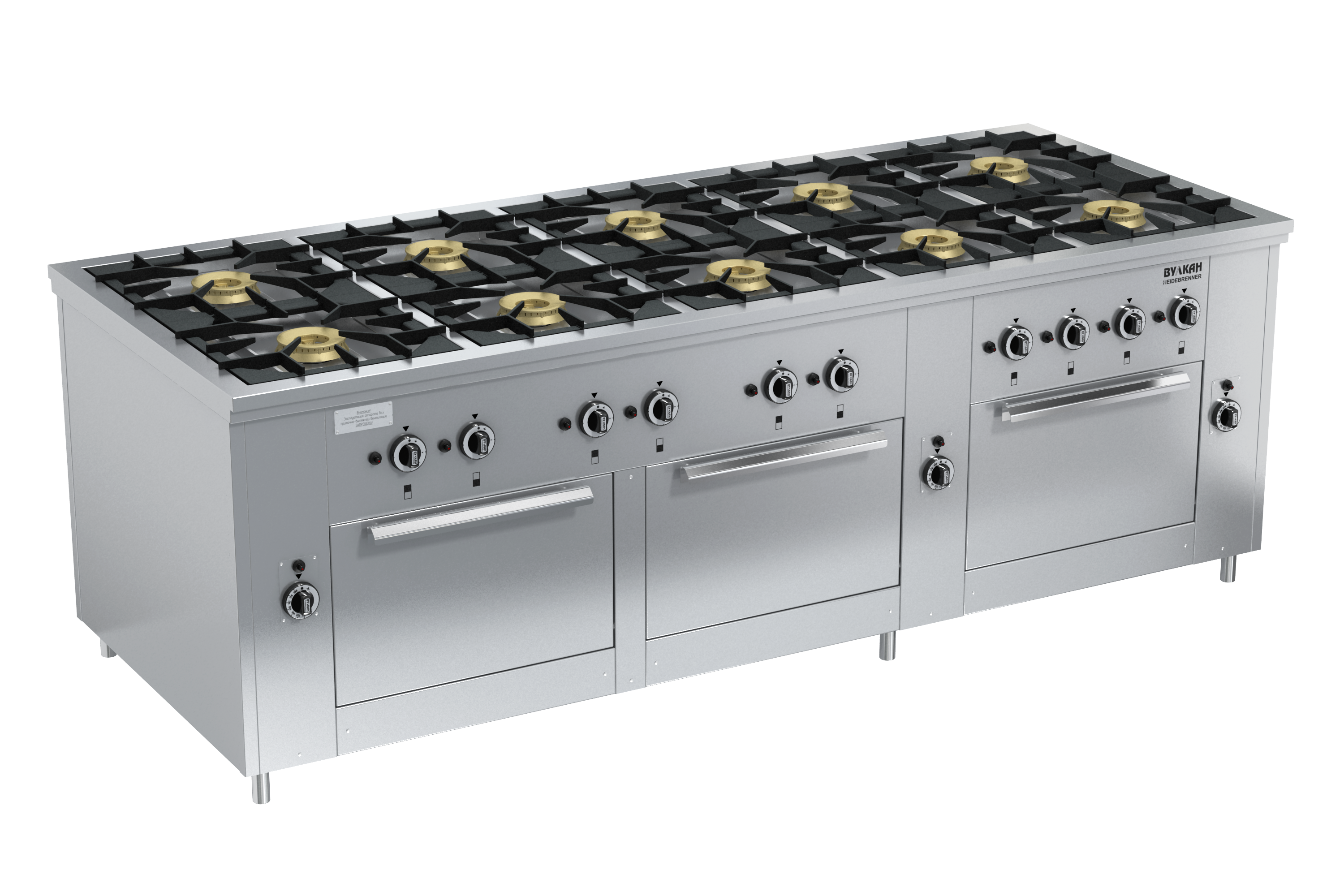 Плита с 10-ю латунными двухрядными горелками, каждая имеет массивную чугунную решетку размером 430х430 мм. Съёмная подконфорочная емкость. В нижней части плиты-3 жарочных шкафа с диапазоном температур 110-325°С. Газконтроль, запальные горелки, пьезоподжиг каждой горелки, работа на природном или сжиженном газе. Ножки плиты регулируются по высоте. *Предложение не является публичной офертой. *Изображение на фото, может отличаться от реального.