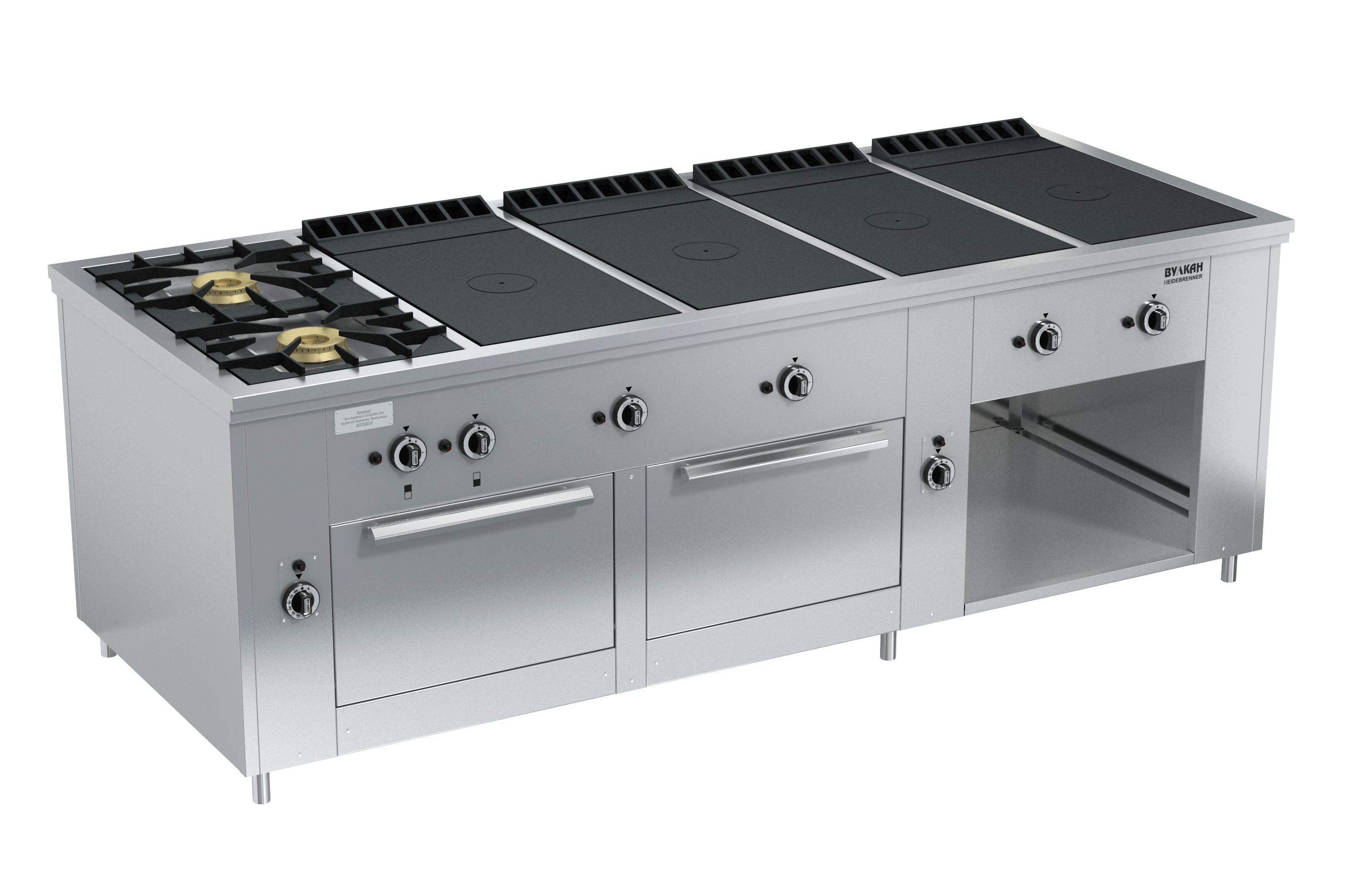 Плита из нержавеющей стали с 2-мя двухрядными горелками и 4-мя варочными чугунными поверхностями. Открытые горелки имеют массивные чугунные решетки размером 430х430 мм, что позволяет размещать на них гастроемкости объемом до 50 л, съёмная подконфорочная емкость. Под чугунными настилами располагаются мощные горелки, быстро и равномерно нагревающие всю поверхность рабочей зоны, благодаря чему на них можно разместить как крупные гастроемкости, так и множество мелких. В нижней части плиты-2 жарочных шкафа с диапазоном температур 110-325°С и ниша для хранения кухонного инвентаря. Газконтроль, запальные горелки, пьезоподжиг каждой горелки, работа на природном или сжиженном газе. Ножки плиты регулируются по высоте. *Предложение не является публичной офертой. *Изображение на фото, может отличаться от реального.