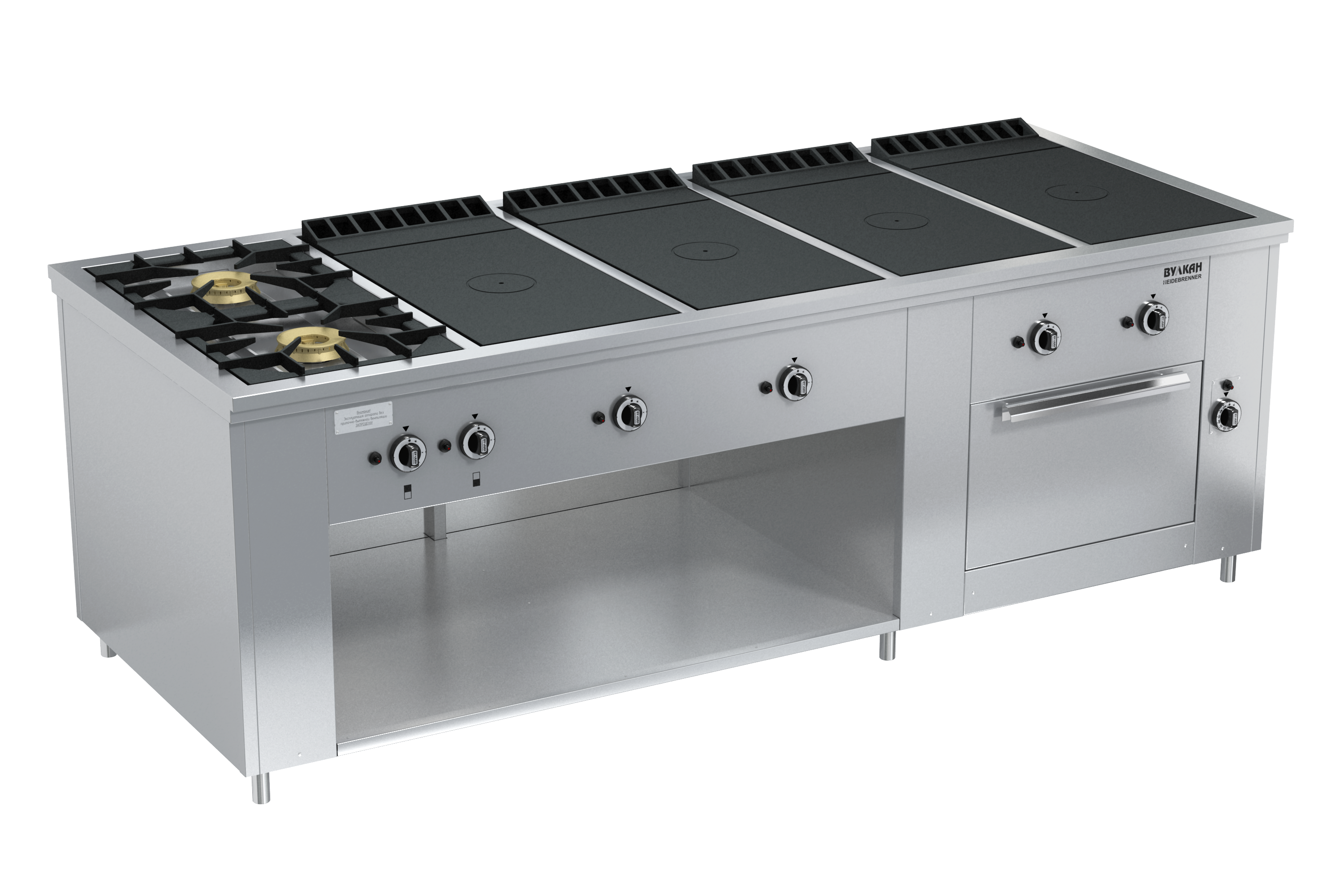 Плита из нержавеющей стали с 2-мя двухрядными горелками и 4-мя варочными чугунными поверхностями. Открытые горелки имеют массивные чугунные решетки размером 430х430 мм, что позволяет размещать на них гастроемкости объемом до 50 л, съёмная подконфорочная емкость. Под чугунными настилами располагаются мощные горелки, быстро и равномерно нагревающие всю поверхность рабочей зоны, благодаря чему на них можно разместить как крупные гастроемкости, так и множество мелких. В нижней части плиты-жарочный шкаф с диапазоном температур 110-325°С и ниша для хранения кухонного инвентаря. Газконтроль, запальные горелки, пьезоподжиг каждой горелки, работа на природном или сжиженном газе. Ножки плиты регулируются по высоте. *Предложение не является публичной офертой. *Изображение на фото, может отличаться от реального.