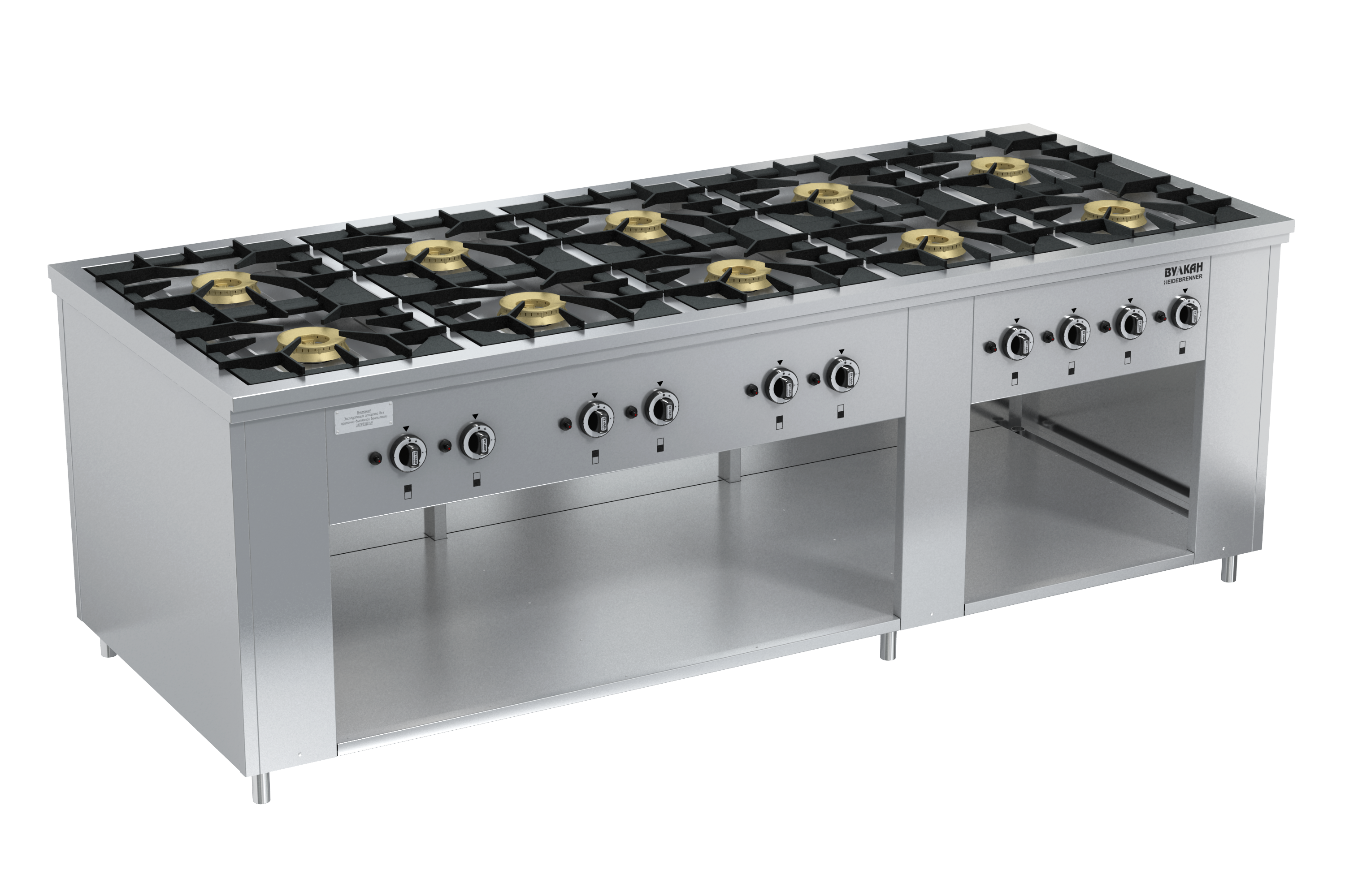 Плита с 10-ю латунными двухрядными горелками, каждая имеет массивную чугунную решетку размером 430х430 мм. Съёмная подконфорочная емкость. В нижней части плиты имеется ниша для хранения кухонного инвентаря. Газконтроль, запальные горелки, пьезоподжиг каждой горелки, работа на природном или сжиженном газе. Ножки плиты регулируются по высоте. *Предложение не является публичной офертой. *Изображение на фото, может отличаться от реального.