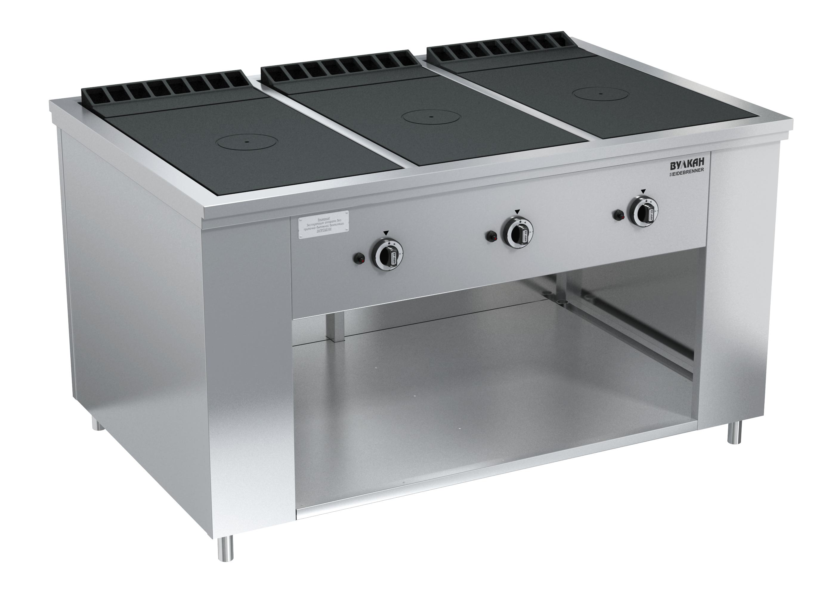 Плита из нержавеющей стали с 3-мя чугунными варочными поверхностями, под которыми располагаются мощные горелки, быстро и равномерно нагревающие всю поверхность рабочей зоны, благодаря чему на них можно разместить как крупные гастроемкости до 50 л, так и множество мелких. В нижней части плиты имеется ниша для хранения кухонного инвентаря. Газконтроль, запальные горелки, пьезоподжиг каждой горелки, работа на природном или сжиженном газе. Ножки плиты регулируются по высоте.