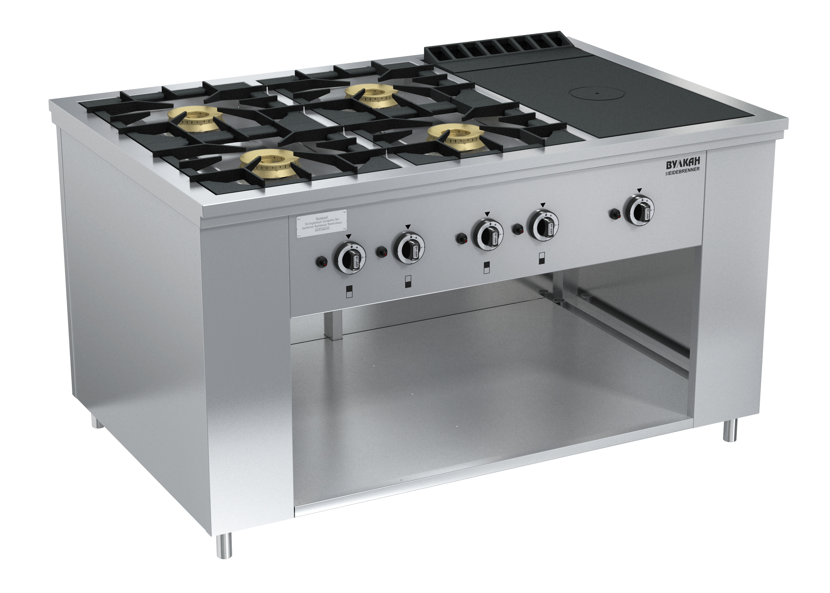 Плита из нержавеющей стали с 4-мя двухрядными горелками и варочной чугунной поверхностью. Открытые горелки имеют массивные чугунные решетки размером 430х430 мм, что позволяет размещать на них гастроемкости объемом до 50 л, съёмная подконфорочная емкость. Под чугунным настилом располагается мощная горелка, быстро и равномерно нагревающая всю поверхность рабочей зоны, благодаря чему на нем можно разместить как крупные гастроемкости, так и множество мелких. В нижней части плиты имеется ниша для хранения кухонного инвентаря. Газконтроль, запальные горелки, пьезоподжиг каждой горелки, работа на природном или сжиженном газе. Ножки плиты регулируются по высоте. *Предложение не является публичной офертой. *Изображение на фото, может отличаться от реального.