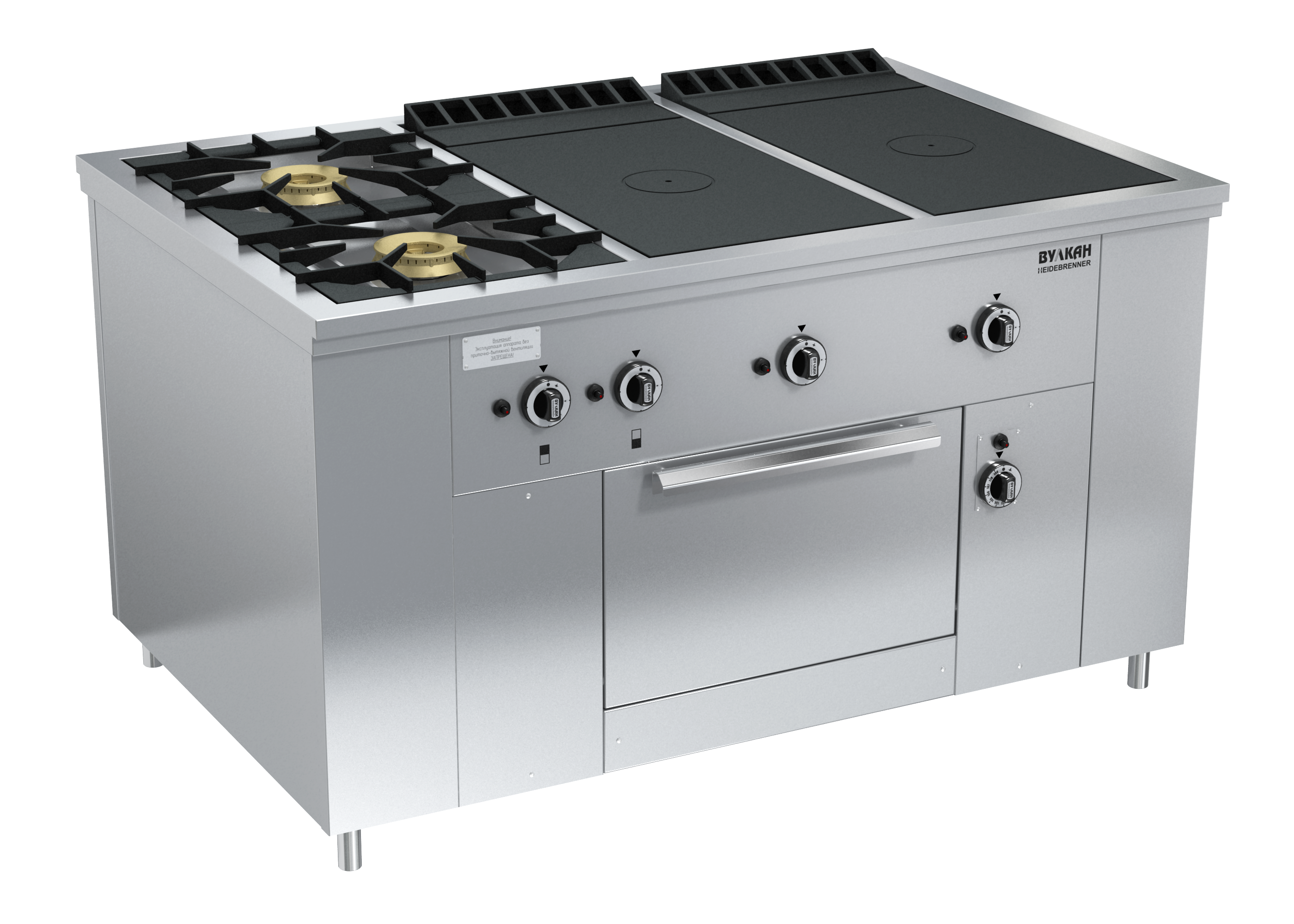 Плита из нержавеющей стали с 2-мя двухрядными горелками и 2-мя варочными чугунными поверхностями. Открытые горелки имеют массивные чугунные решетки размером 430х430 мм, что позволяет размещать на них гастроемкости объемом до 50 л, съёмная подконфорочная емкость. Под чугунными настилами располагаются мощные горелки, быстро и равномерно нагревающие всю поверхность рабочей зоны, благодаря чему на них можно разместить как крупные гастроемкости, так и множество мелких. В нижней части плиты-жарочный шкаф с диапазоном температур 110-325°С. Газконтроль, запальные горелки, пьезоподжиг каждой горелки, работа на природном или сжиженном газе. Ножки плиты регулируются по высоте.