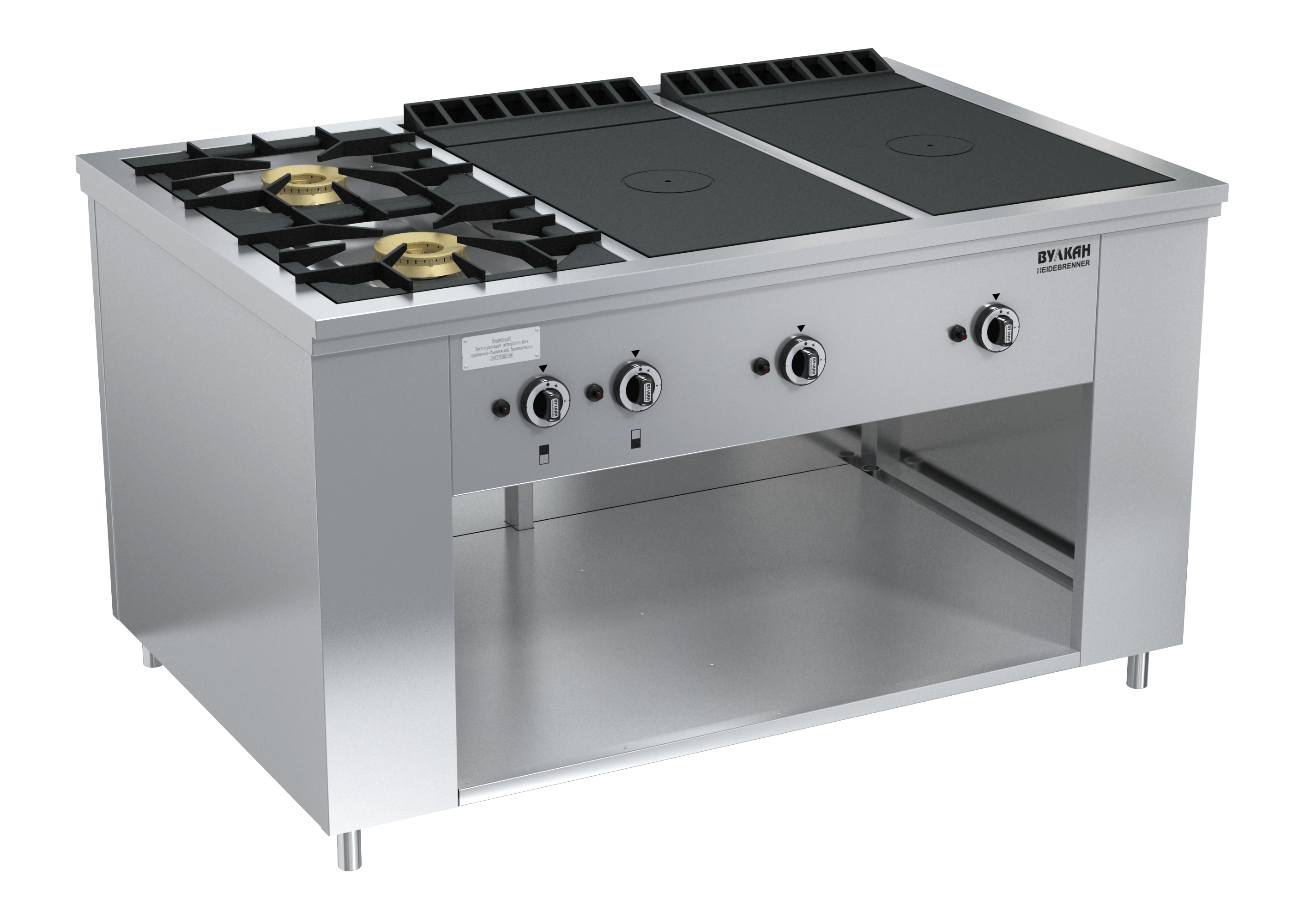 Плита из нержавеющей стали с 2-мя двухрядными горелками и 2-мя варочными чугунными поверхностями. Открытые горелки имеют массивные чугунные решетки размером 430х430 мм, что позволяет размещать на них гастроемкости объемом до 50 л, съёмная подконфорочная емкость. Под чугунными настилами располагаются мощные горелки, быстро и равномерно нагревающие всю поверхность рабочей зоны, благодаря чему на них можно разместить как крупные гастроемкости, так и множество мелких. В нижней части плиты имеется ниша для хранения кухонного инвентаря. Газконтроль, запальные горелки, пьезоподжиг каждой горелки, работа на природном или сжиженном газе. Ножки плиты регулируются по высоте. *Предложение не является публичной офертой. *Изображение на фото, может отличаться от реального.