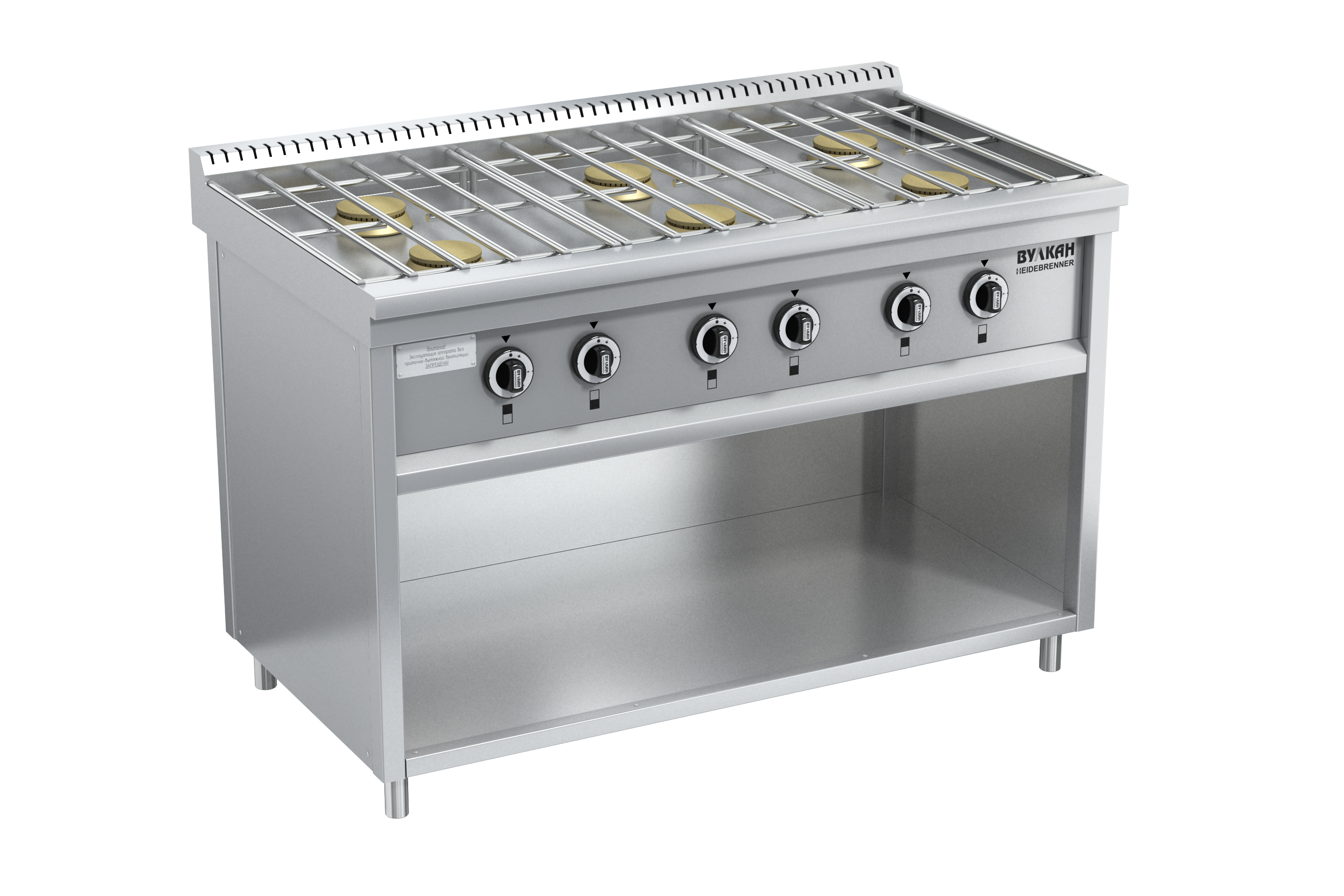 Плита из нержавеющей стали с 6-ю горелками по 6 кВт, съёмной решеткой из нержавеющей стали. В нижней части плиты имеется ниша для хранения кухонного инвентаря, газконтроль, работа на природном или сжиженном газе, герметичная столешница, ножки плиты регулируются по высоте. *Предложение не является публичной офертой. *Изображение на фото, может отличаться от реального.