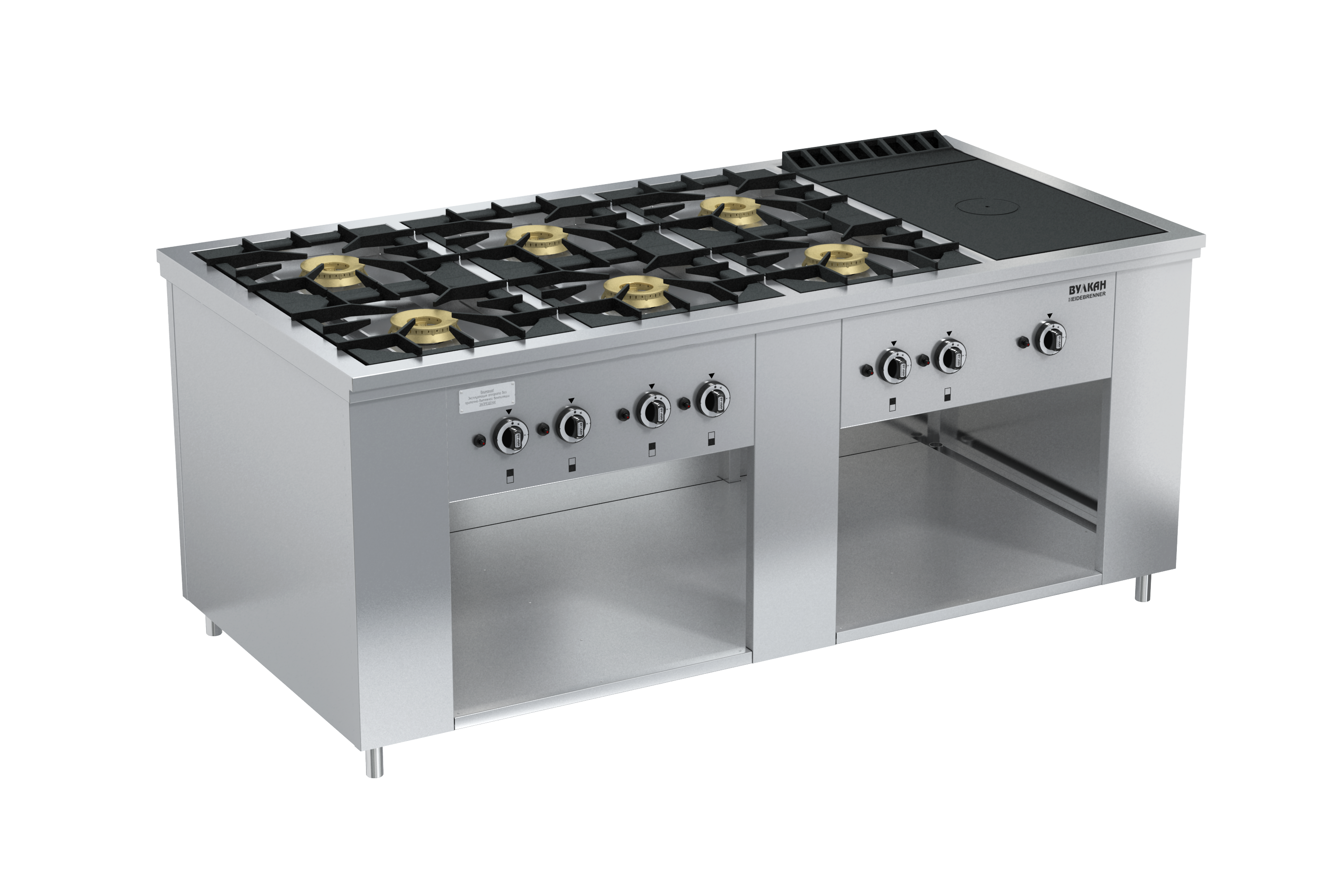 Плита из нержавеющей стали с 6-ю двухрядными горелками и варочной чугунной поверхностью. Открытые горелки имеют массивные чугунные решетки размером 430х430 мм, что позволяет размещать на них гастроемкости объемом до 50 л, съёмная подконфорочная емкость. Под чугунным настилом располагается мощная горелка, быстро и равномерно нагревающая всю поверхность рабочей зоны, благодаря чему на нем можно разместить как крупные гастроемкости, так и множество мелких. В нижней части плиты имеется ниша для хранения кухонного инвентаря. Газконтроль, запальные горелки, пьезоподжиг каждой горелки, работа на природном или сжиженном газе. Ножки плиты регулируются по высоте. *Предложение не является публичной офертой. *Изображение на фото, может отличаться от реального.