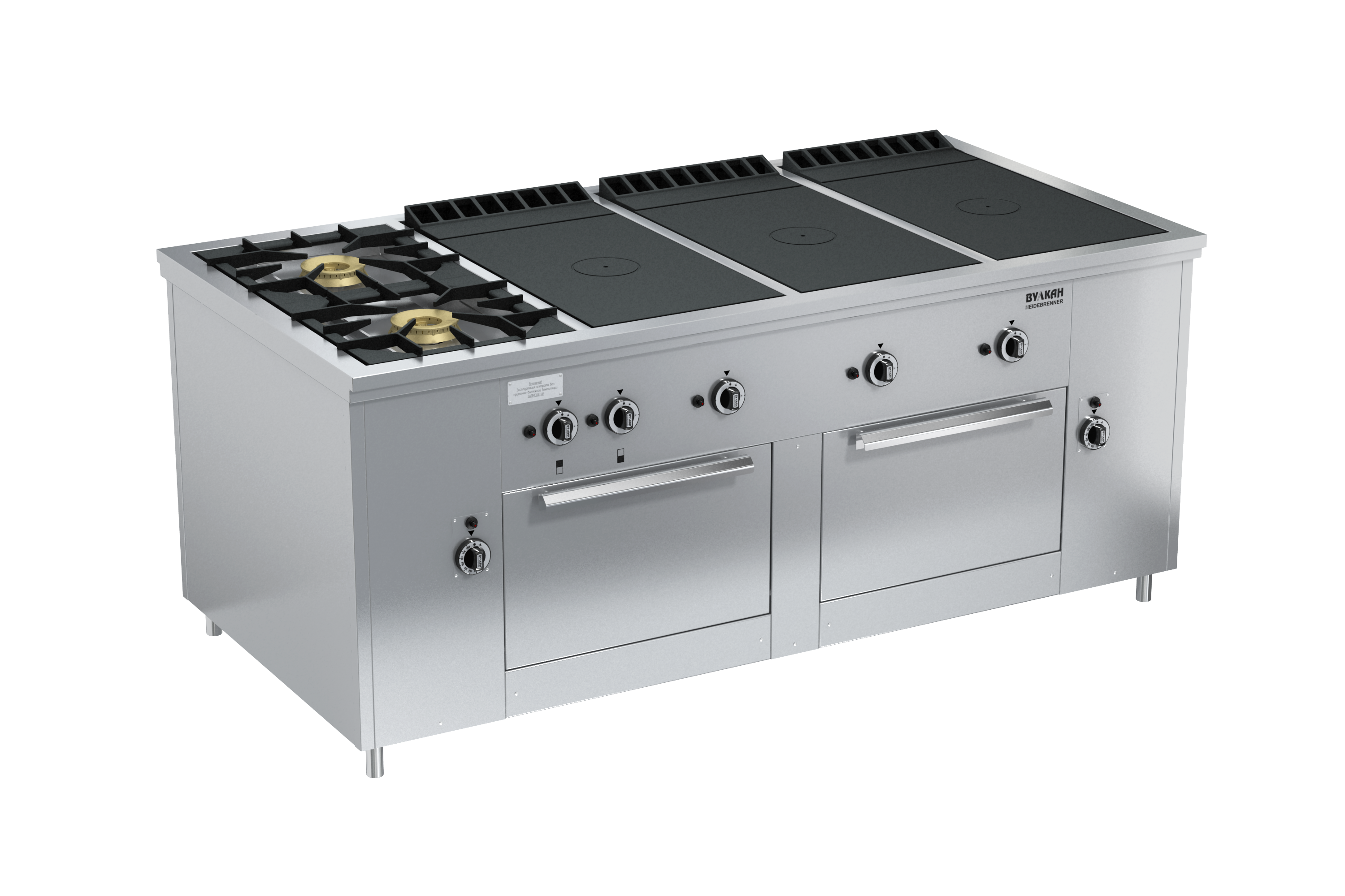 Плита из нержавеющей стали с 2-мя двухрядными горелками и 3-мя варочными чугунными поверхностями. Открытые горелки имеют массивные чугунные решетки размером 430х430 мм, что позволяет размещать на них гастроемкости объемом до 50 л, съёмная подконфорочная емкость. Под чугунными настилами располагаются мощные горелки, быстро и равномерно нагревающие всю поверхность рабочей зоны, благодаря чему на них можно разместить как крупные гастроемкости, так и множество мелких. В нижней части плиты-2 жарочных шкафа с диапазоном температур 110-325°С. Газконтроль, запальные горелки, пьезоподжиг каждой горелки, работа на природном или сжиженном газе. Ножки плиты регулируются по высоте. *Предложение не является публичной офертой. *Изображение на фото, может отличаться от реального.