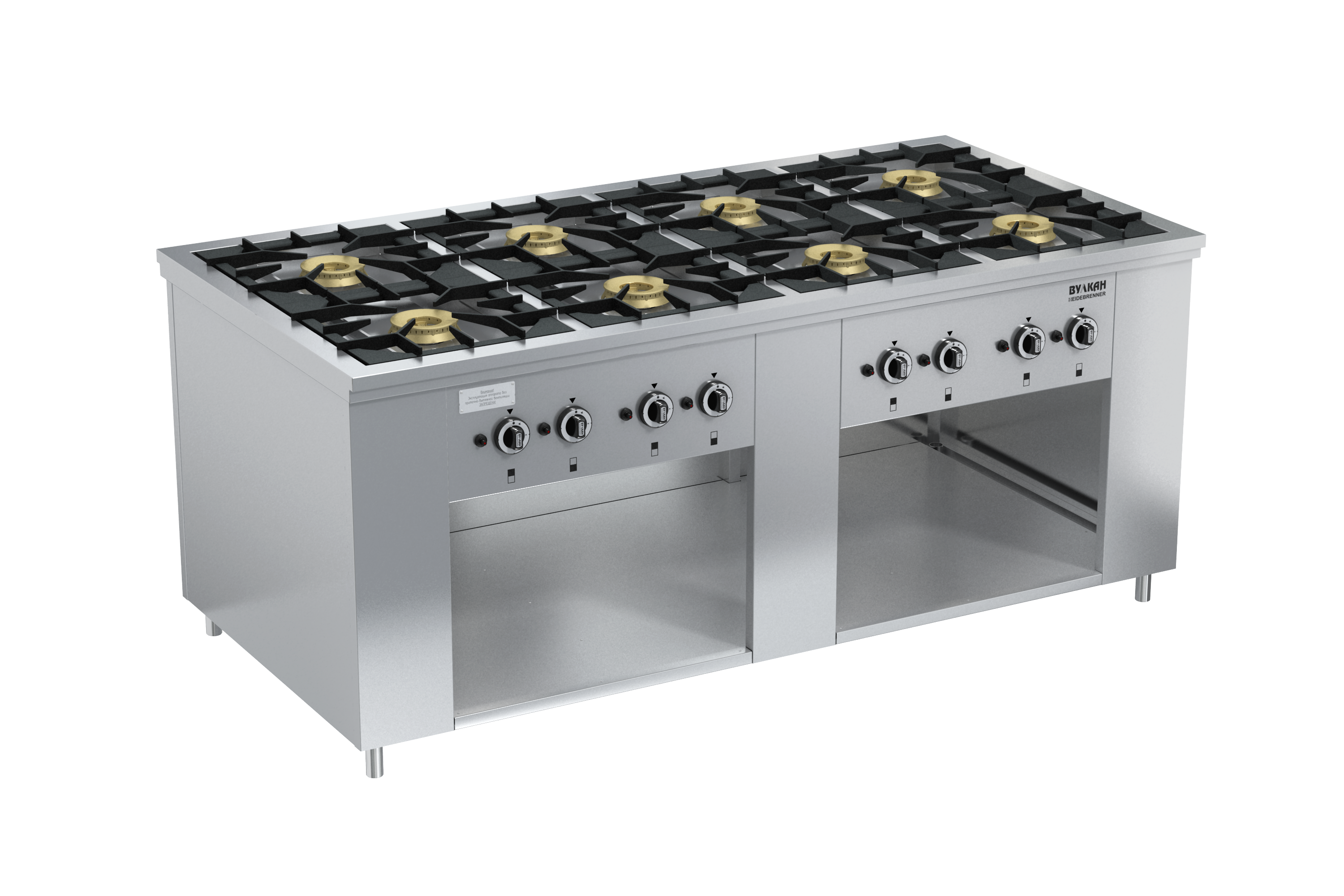 Плита с 8-ю латунными двухрядными горелками, каждая имеет массивную чугунную решетку размером 430х430 мм. Съёмная подконфорочная емкость. В нижней части плиты имеется ниша для хранения кухонного инвентаря. Газконтроль, запальные горелки, пьезоподжиг каждой горелки, работа на природном или сжиженном газе. Ножки плиты регулируются по высоте. *Предложение не является публичной офертой. *Изображение на фото, может отличаться от реального.