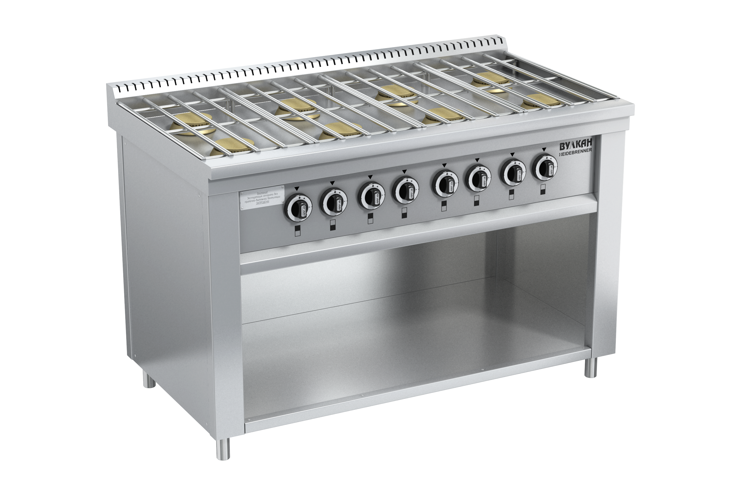 Плита из нержавеющей стали с 8-ю горелками по 6 кВт, съёмной решеткой из нержавеющей стали. В нижней части плиты имеется ниша для хранения кухонного инвентаря, газконтроль, работа на природном или сжиженном газе, герметичная столешница, ножки плиты регулируются по высоте.