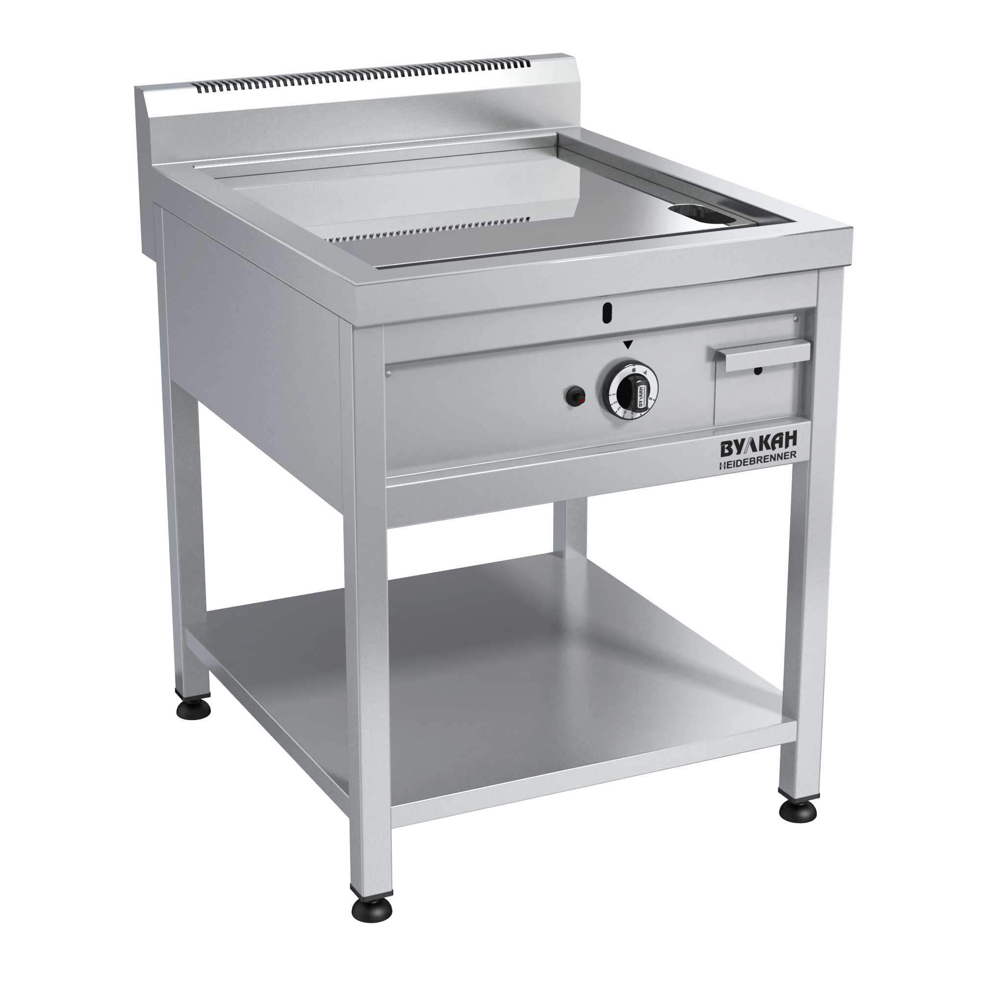 Напольная плита теппан-яки из нержавеющей стали с зеркальной биметаллической поверхностью общей толщиной 35мм, которое защищает продукты от пригорания во время жарки. На поверхности- сливное отверстие для сбора жира, съёмный жиросборник. Жарочная поверхность: 548х540мм. Газконтроль, запальная горелка, пьезоподжиг, сливное отверстие и поддон, коллектор для выхода отработанных газов.