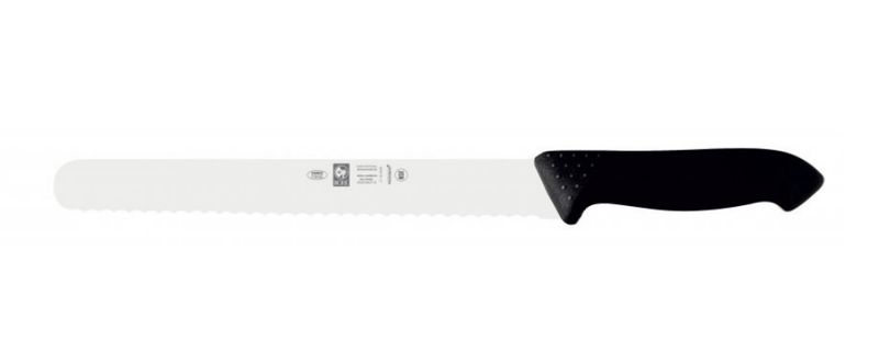 Лезвия ножей изготавливаются из высококачественной стали с добавлением хрома, молибдена и ванадия и закаливаются по специальной технологии. Твердость стали составляет более 56 HRC. Ручная заточка. Угол заточки обеспечивает отличную режущую способность. Ручки эргономичные из не скользящего пластика ProFlex с антибактериальной защитой Microban; ширина лезвия 25 мм, длина лезвия 250 мм, длина ножа 390 мм